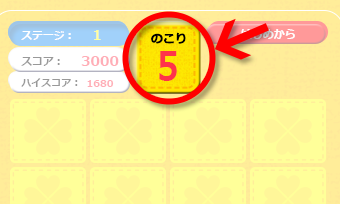 ウラむきのカードの中から、2枚ずつカードをめくってね。2枚が同じカードならカードがなくなるよ。[のこり]は、おてつきがゆるされる回数。どこにどのカードがあったかをおぼえて、[のこり]の数が0になる前に、ぜんぶのカードをなくしてね。